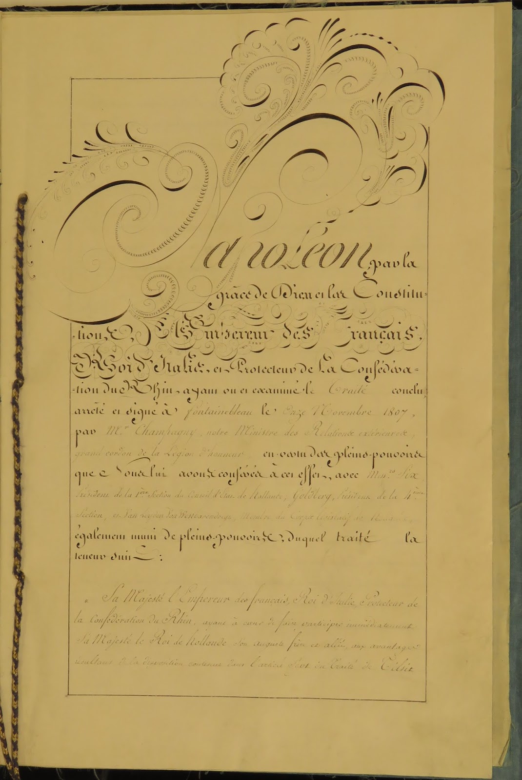 Een dag later, 12 november 1807, ratificeert l'Empereur de France Napoleon, tevens koning van Italië en beschermer van de Rijnstaten, het verdrag persoonlijk in een veel mooiere akte met een groot uithangend keizerlijk zegel in een messing blikje en met prachtige tressen eraan. Dat ziet er nogal wat professioneler en gestoffeerder uit: